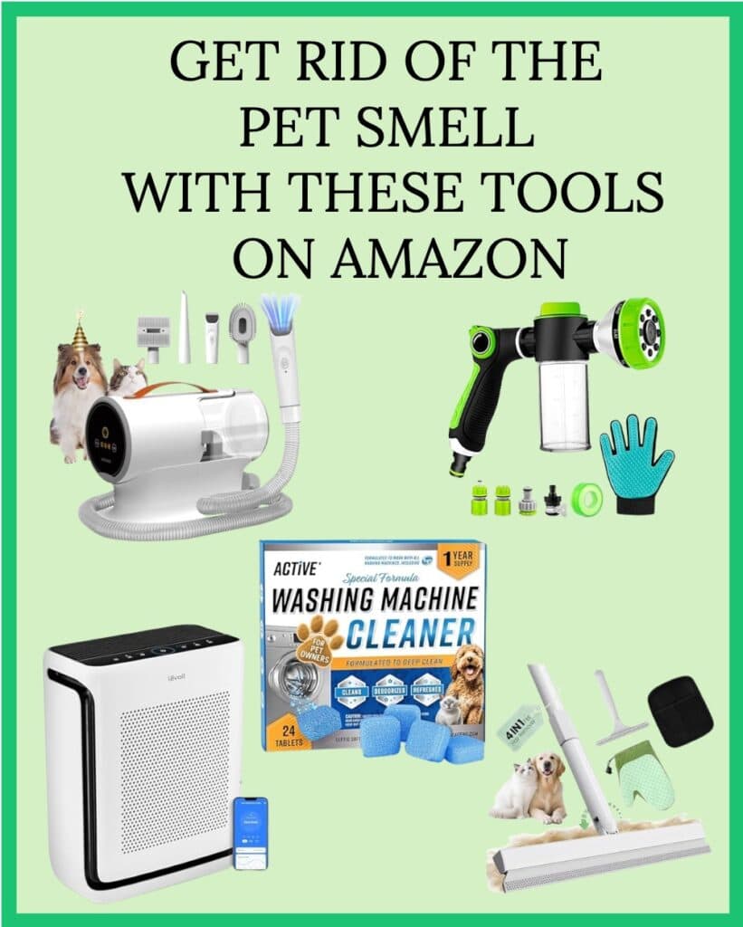 Another great trick to help lessen the smell is to groom your pets. Last summer, I bought this dog grooming vacuum kit, and it has been a massive game-changer in our house. With four dogs that shed, I felt like I was cleaning up dog hair nonstop. Not anymore. This vacuum is very quiet, and even my most skittish pup doesn't run from it. They actually all sit like they are enjoying a spa session.